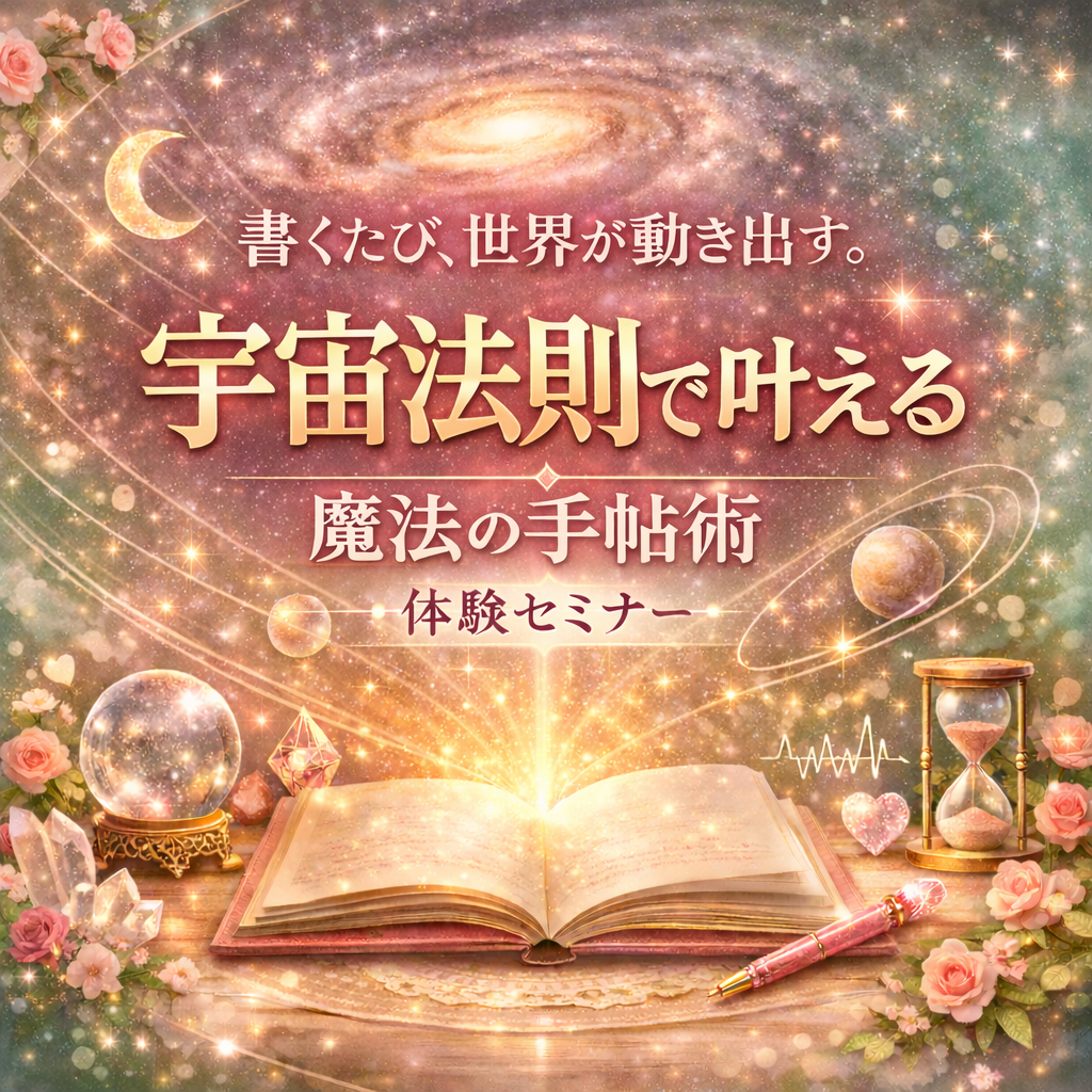 このセミナーでは、宇宙法則をわかりやすい言葉でお伝えし、手帖で現実を動かす超再現性のある方法を公開します。